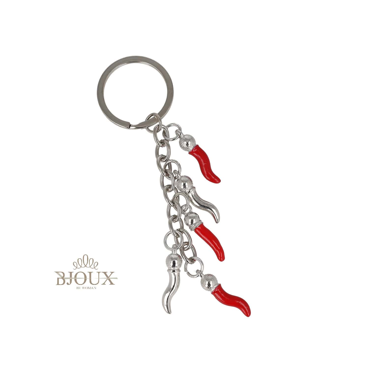 Portachiavi in acciaio inossidabile rodiato con pendenti cornetti portafortuna da 1,5 cm. Può essere utilizzato anche come ciondolo borsa.