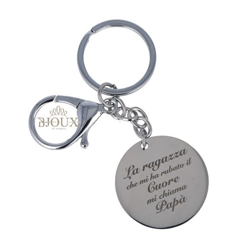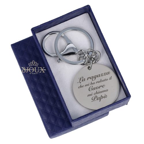 Portachiavi realizzato completamente in acciaio inossidabile con gancio e rondella. Ciondolo con targa incisa dal diametro 3,5 cm con dedica. Astuccio regalo 5x8x3 cm