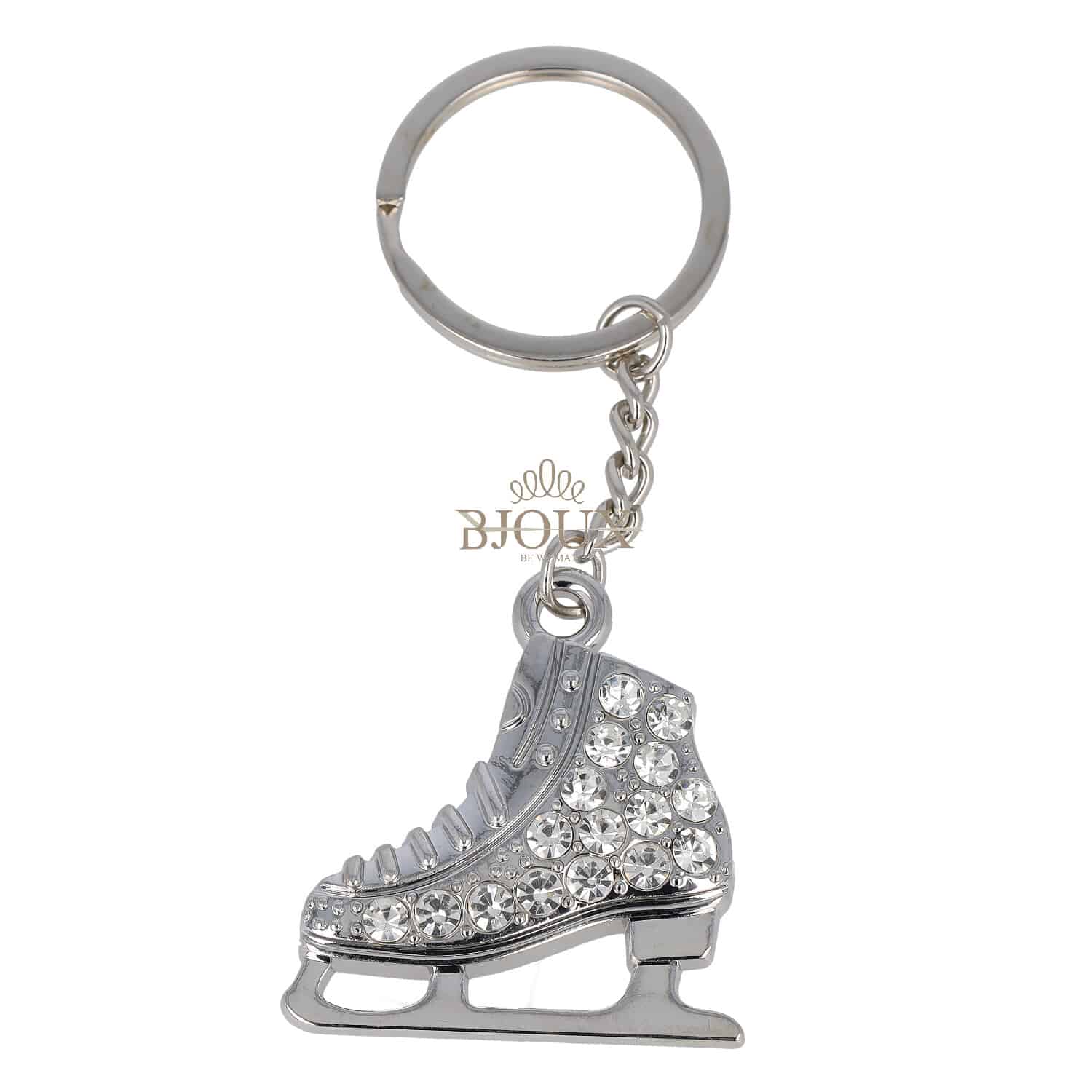 Portachiavi in ottone dipinto color rodio con pendenti charms a tema pattinaggio strass. Colore rodio