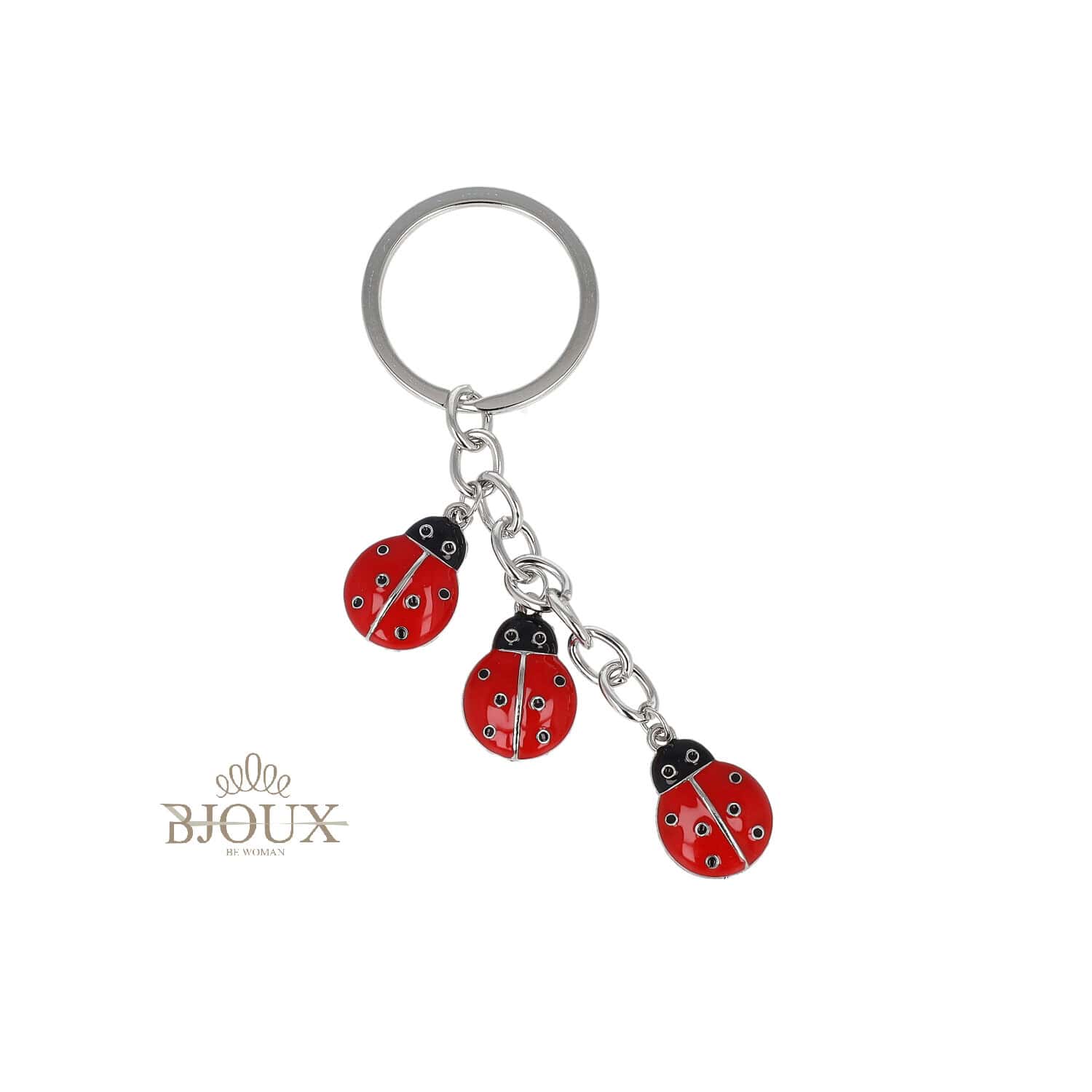 Portachiavi in acciaio inossidabile rodiato con ciondoli tre coccinelle smaltate da 2 cm. Può essere utilizzato anche come ciondolo borsa.