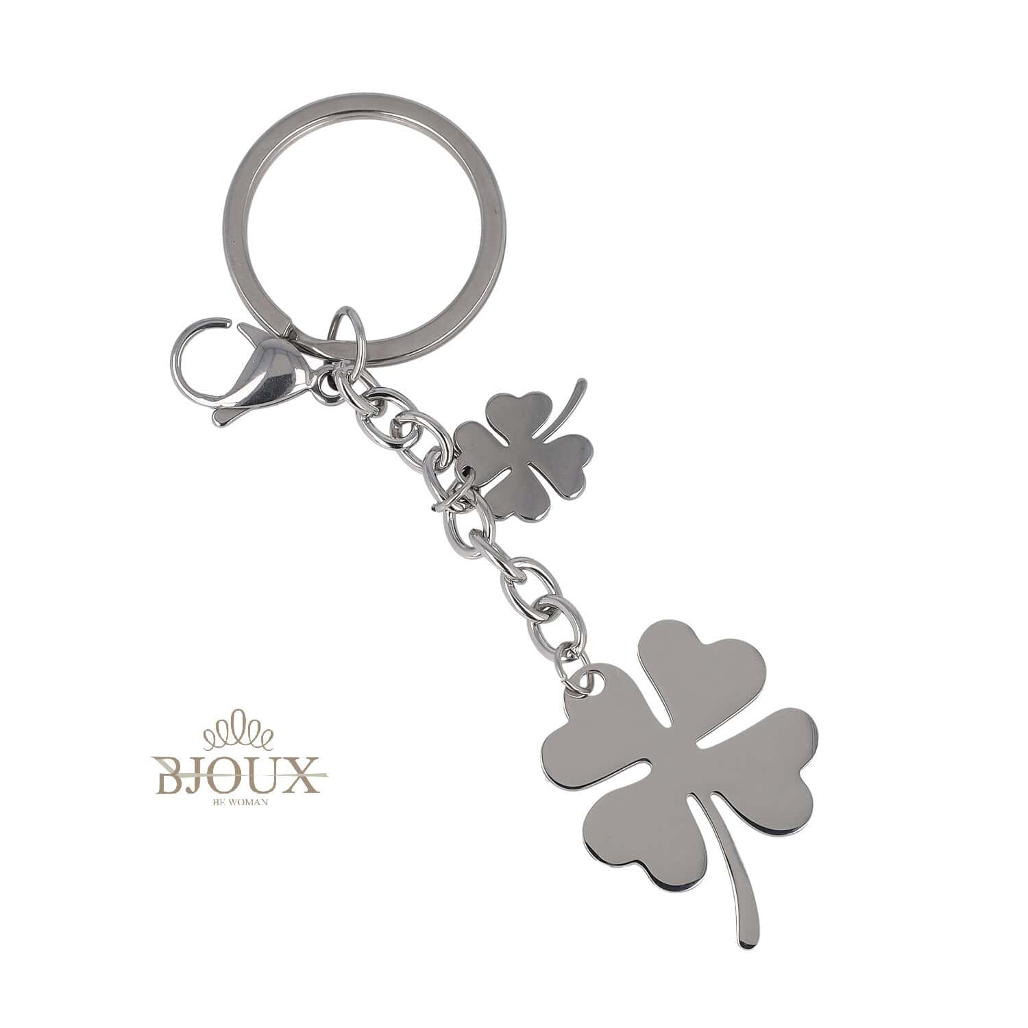 Portachiavi in acciaio inossidabile con charms quadrifogli portafortuna. Con rondella e gancio per borse.