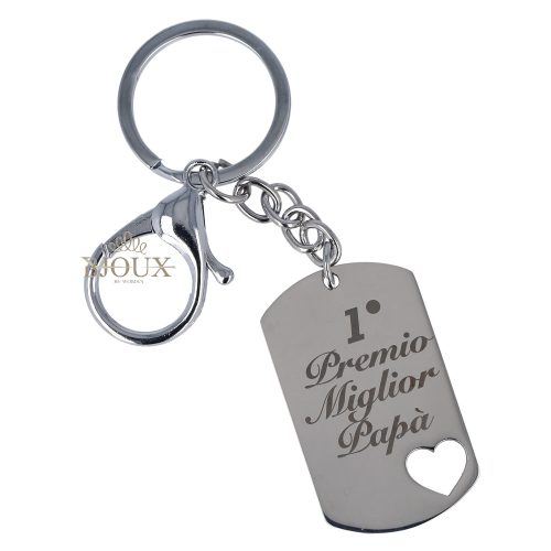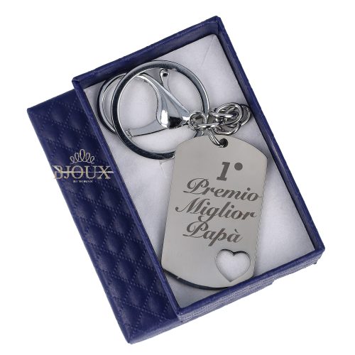 Portachiavi realizzato completamente in acciaio inossidabile con gancio e rondella. Ciondolo con targa incisa misura 4,5×2,5 cm con dedica. Astuccio regalo 5x8x3 cm
