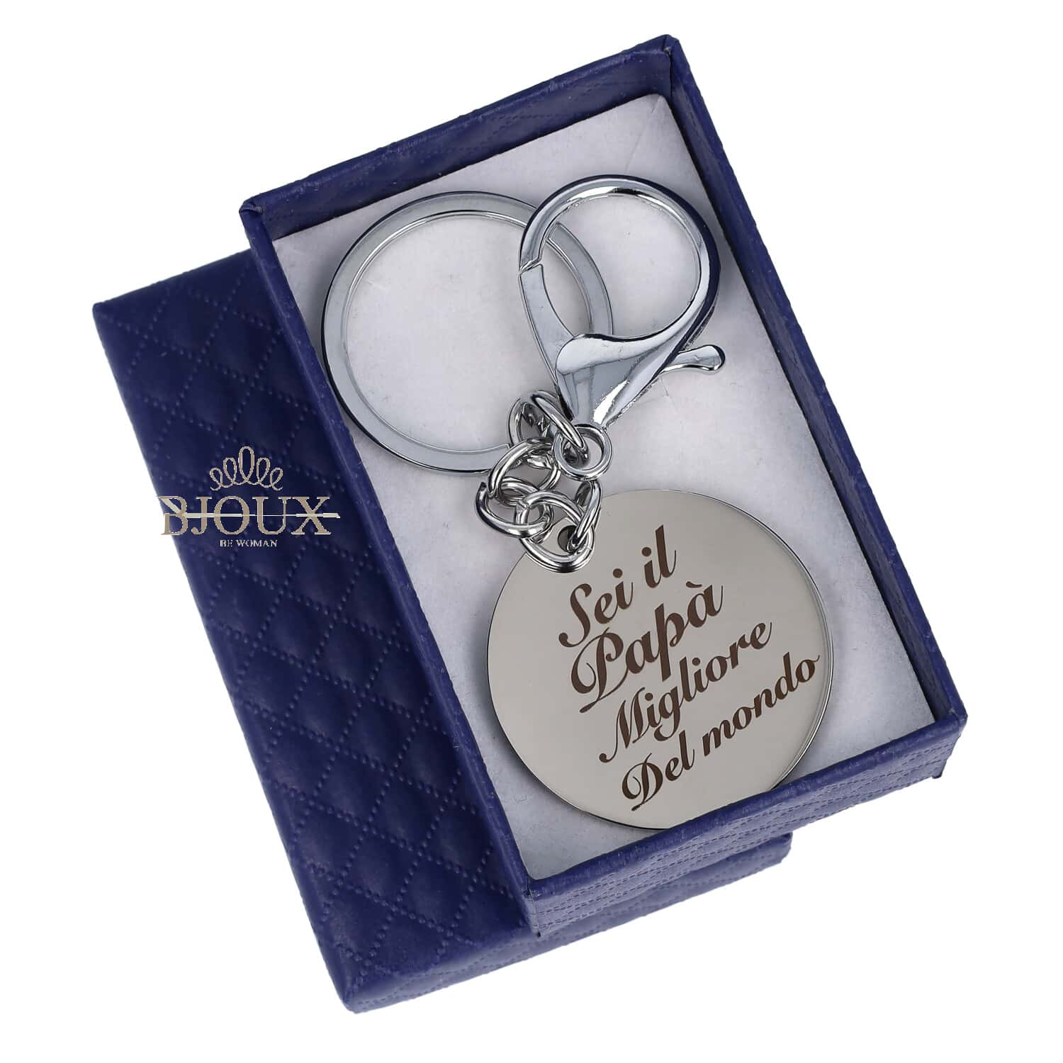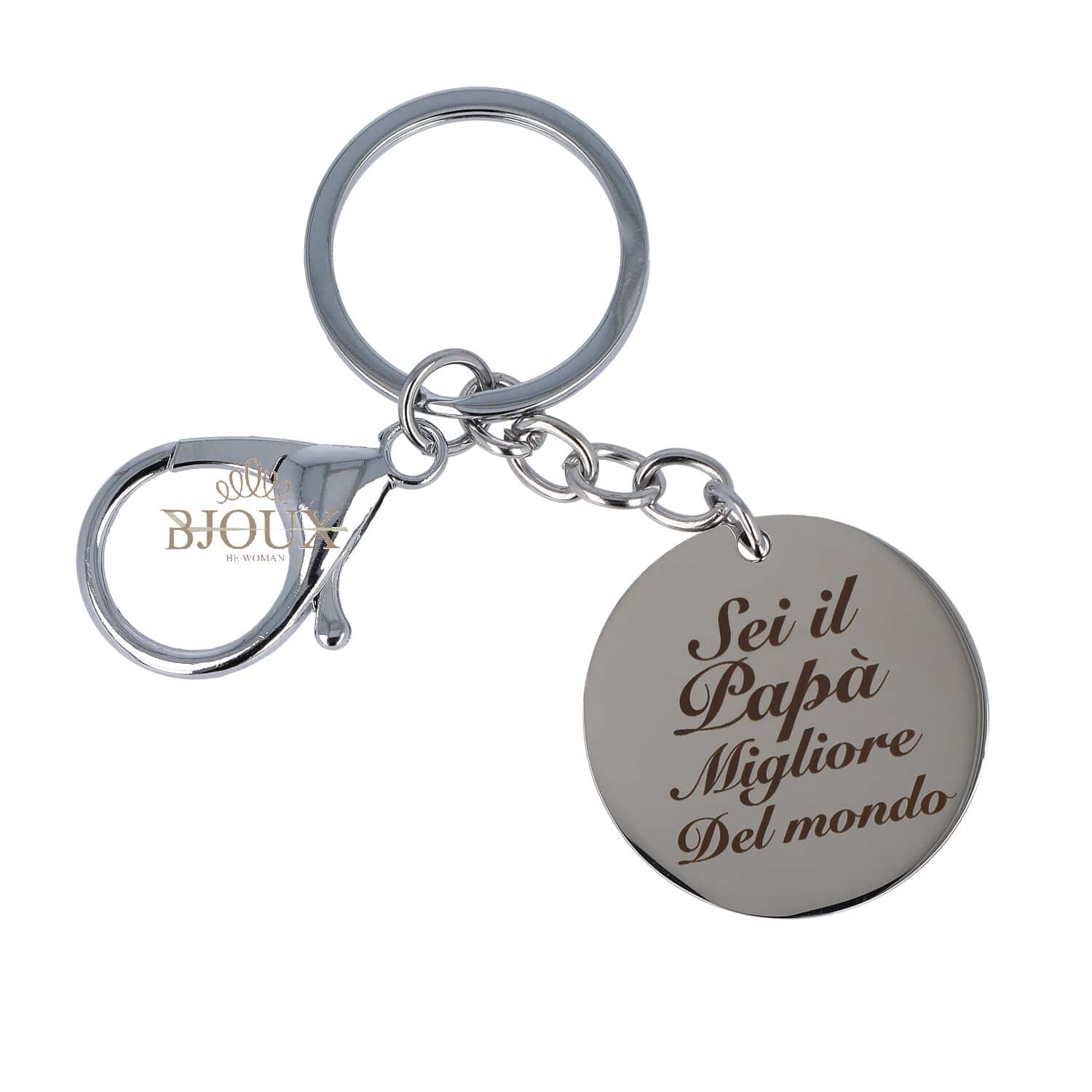 Portachiavi realizzato completamente in acciaio inossidabile con gancio e rondella. Ciondolo con targa incisa diametro 3,5 cm con dedica. Astuccio regalo 5x8x3 cm