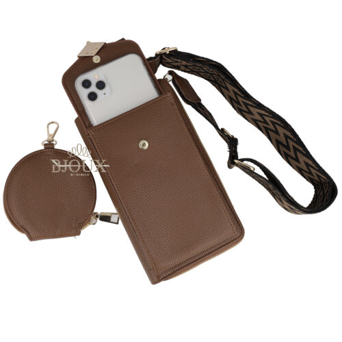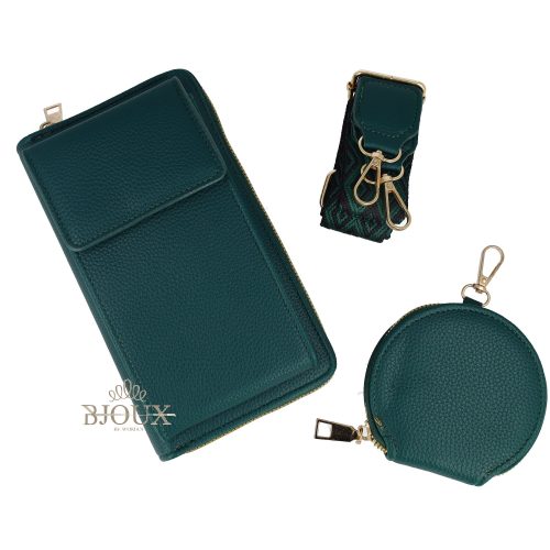 Portafoglio in ecopelle colorata con tracolla, borsellino portamonete e portacellulare. Tutti gli interni sono organizzati in scomparti per monete, carte di credito e banconote. Misure 20x12x4,5