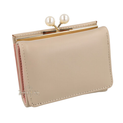 Portafoglio in ecopelle colorata con chiusura a bottone e a scatto con perle. Tutti gli interni sono organizzati in scomparti per monete, carte di credito e banconote. Misure 11x8x4