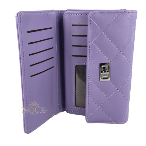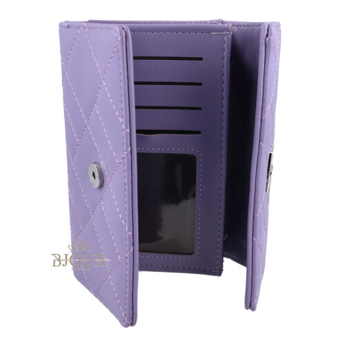Portafoglio in ecopelle colorata con chiusura a bottone e a zip. Tutti gli interni sono organizzati in scomparti per carte di credito , monete e banconote. Misure 16x10x4