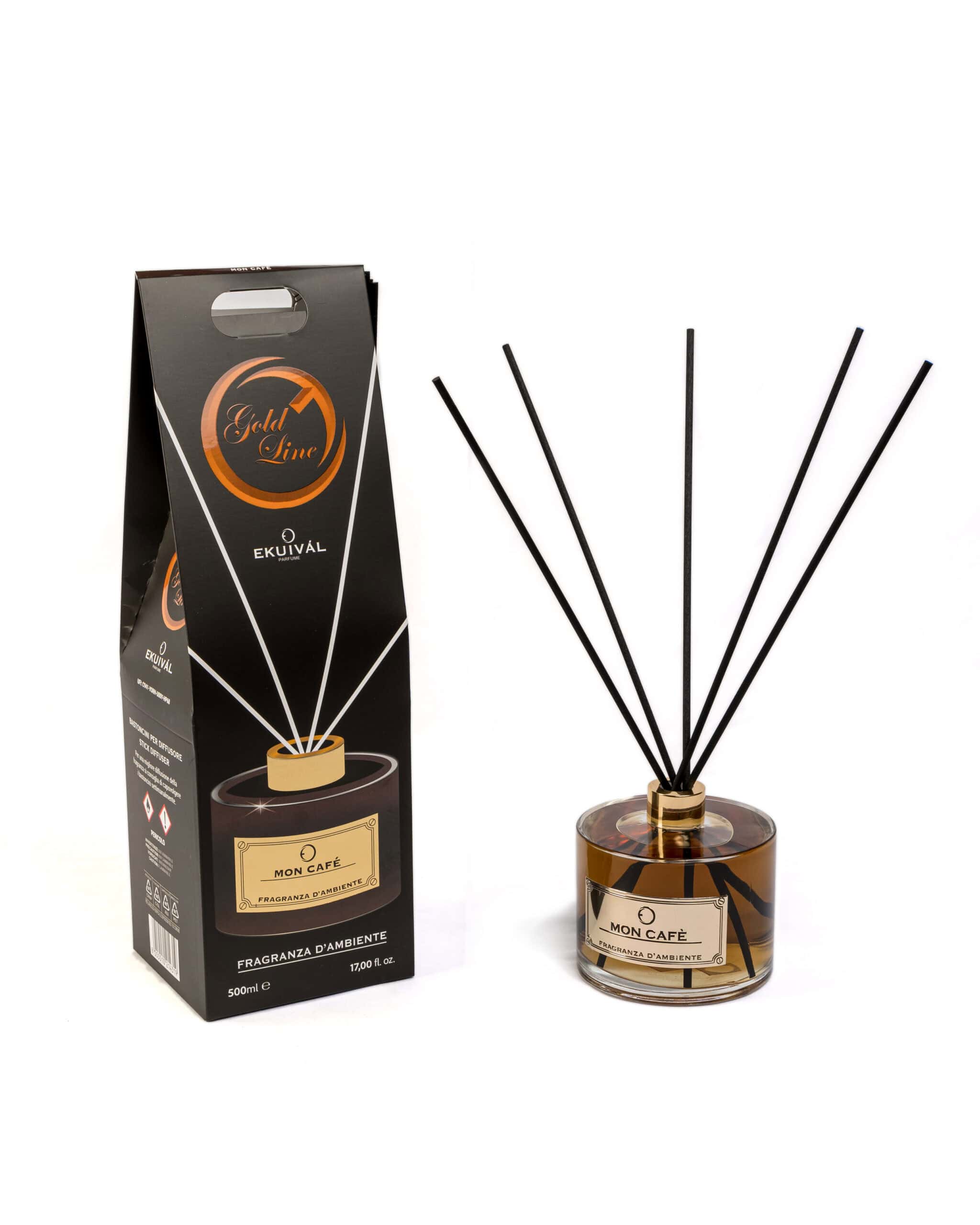 Fragranza per ambiente da 500 ml : Mon Cafè e una fragranza che nasce per creare un’atmosfera olfattiva accogliente . Con bastoncini per diffusore. Diametro flacone 11 cm