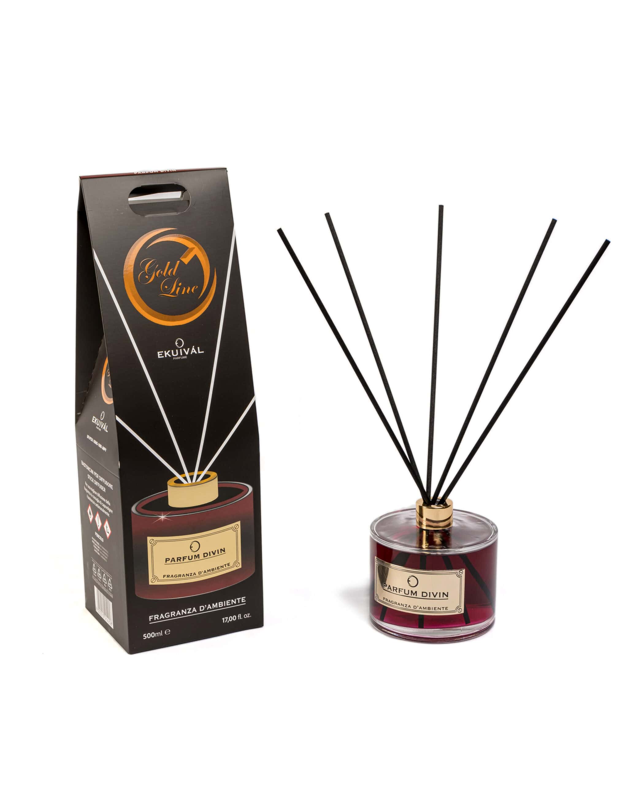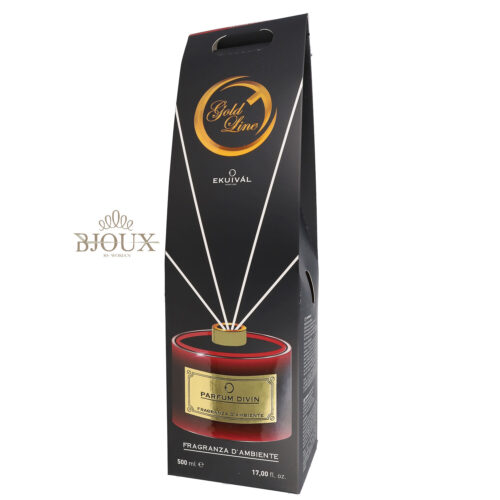 Fragranza per ambiente da 500 ml : Parfum Divine una fragranza che nasce per creare un’atmosfera olfattiva vivace ed accogliente . Con bastoncini per diffusore. Diametro flacone 11 cm