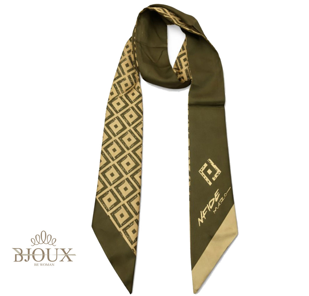 Sciarpina lunga dal design geometrico nei toni verde oliva e beige. Moderna e lineare, perfetta per completare look minimal con un tocco distintivo.