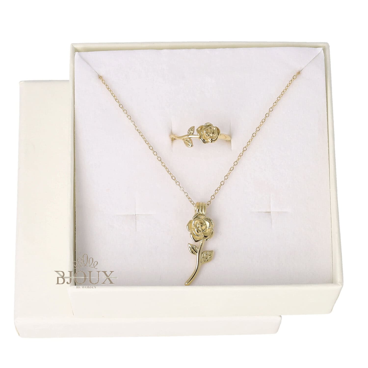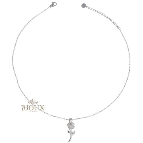 Collana di bigiotteria in acciaio inossidabile con rosa pendente da 3 cm . Lung. catena 37+5 cm abbinata all’anello misura regolabile. Astuccio regalo 9X9