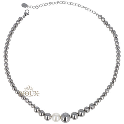 Collana di bigiotteria in acciaio inossidabile da 40 + 5 cm composta da sfere a gradazione con perla bianca abbinata al bracciale catena da 16 + 3 cm , con sfere a gradazione con perla centrale. Astuccio regalo 12×16