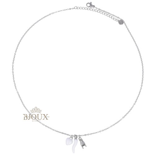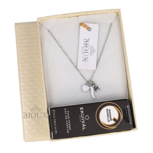 Idea regalo composta da una collanina in acciaio inossidabile con ciondoli portafortuna smaltati e colorata, con profumo equivalente da donna ispirato a ispirato a Coco Modemoseille Chanel formato da 15ml. Astuccio 13×9