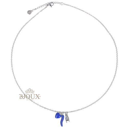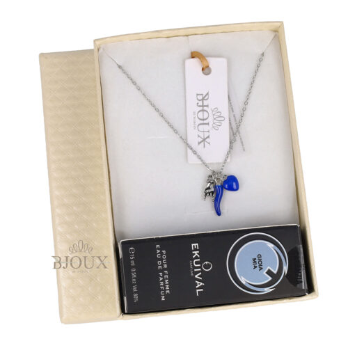 Idea regalo composta da una collanina in acciaio inossidabile con ciondoli portafortuna smaltati e colorata, con profumo equivalente da donna ispirato a ย Armani Acqua di Gioia formato da 15ml. Astuccio 13×9