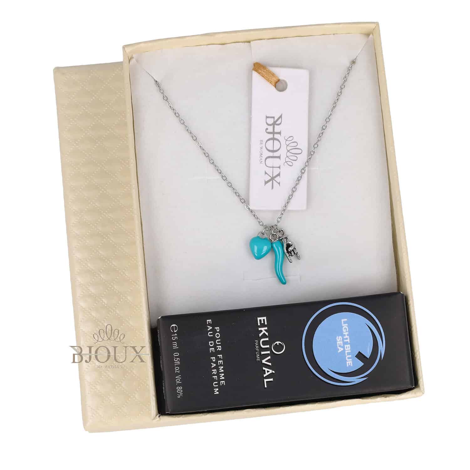 Idea regalo composta da una collanina in acciaio inossidabile con ciondoli portafortuna smaltati e colorata, con profumo equivalente da donna ispirato aa Light Blue Dolce Gabbana formato da 15ml. Astuccio 13×9