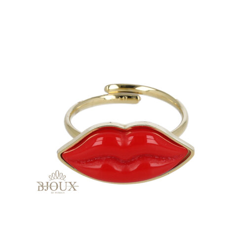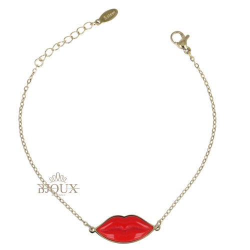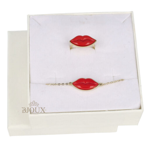 Idea regalo composto da un bracciale da donna in acciaio inossidabile con bacio rosso smaltatoย cm abbinato ad anello regolabile con bacio da 2 cm.