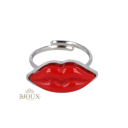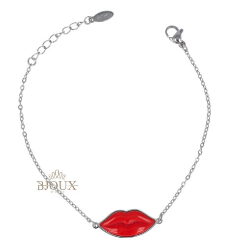 Idea regalo composto da un bracciale da donna in acciaio inossidabile con bacio rosso smaltatoย cm abbinato ad anello regolabile con bacio da 2 cm.