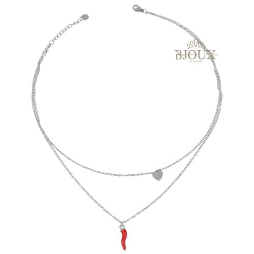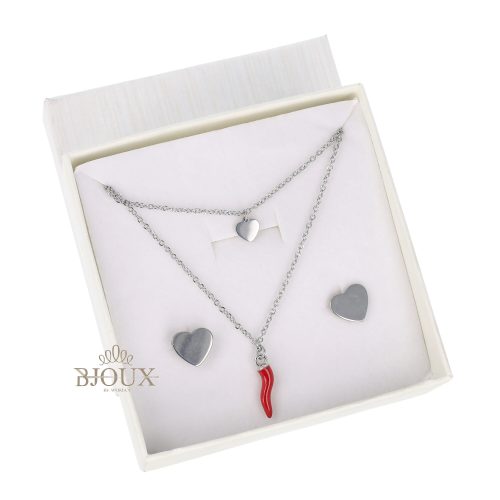Collana in acciaio inossidabile a catena con extension per regolarne la misura. Con cuoricini e cornetto rosso portafortuna da 1,5 cm con orecchini in acciaio con perno . In astuccio regalo 9×9