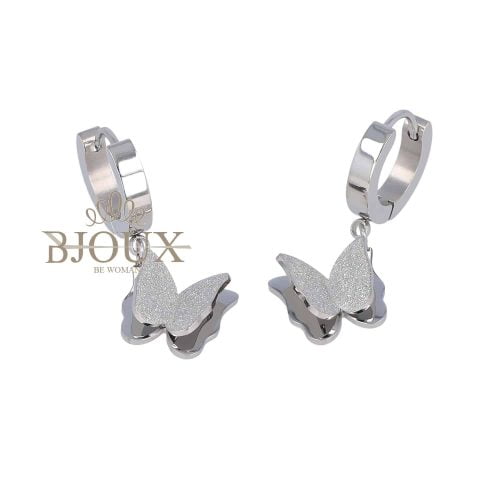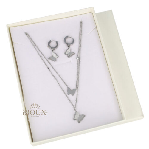 Idea regalo composto da una collana catenina composta da due fili in acciaio inossidabile con estensione per regolarne la lunghezza. Pendente farfalla glitterata e orecchini hoop con farfalla pendente.