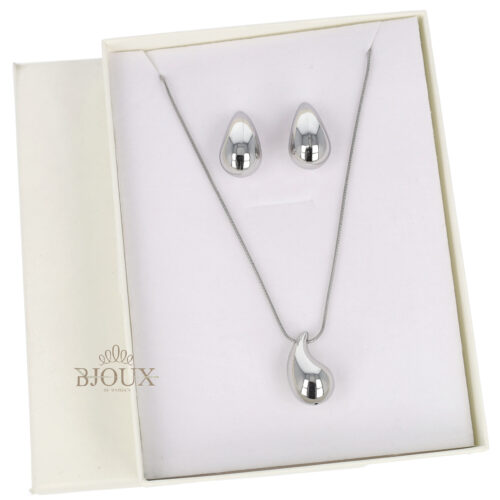 Idea regalo composto da una collana da donna in acciaio inossidabile con goccia da 26 mm. Lunghezza 40cm + 5 cm estensione abbinata a orecchini a perno goccia da 26 mm.