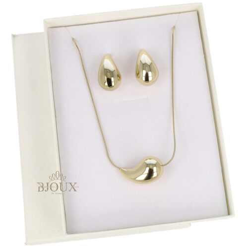 Idea regalo composto da una collana da donna in acciaio inossidabile con goccia da 31 mm. Lunghezza 37cm + 5 cm estensione abbinata a orecchini a perno goccia da 31ย mm.
