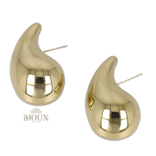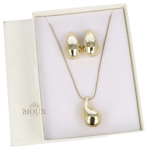 Idea regalo composto da una collana da donna in acciaio inossidabile con goccia da 39 mm. Lunghezza 40 cm + 5 cm estensione abbinata a orecchini a perno goccia da 39ย mm.