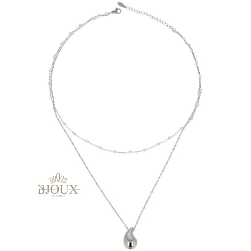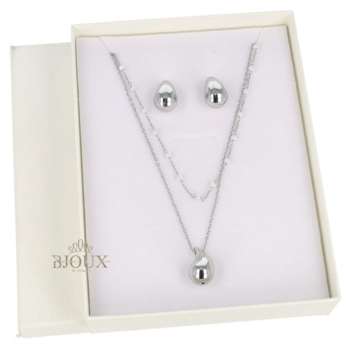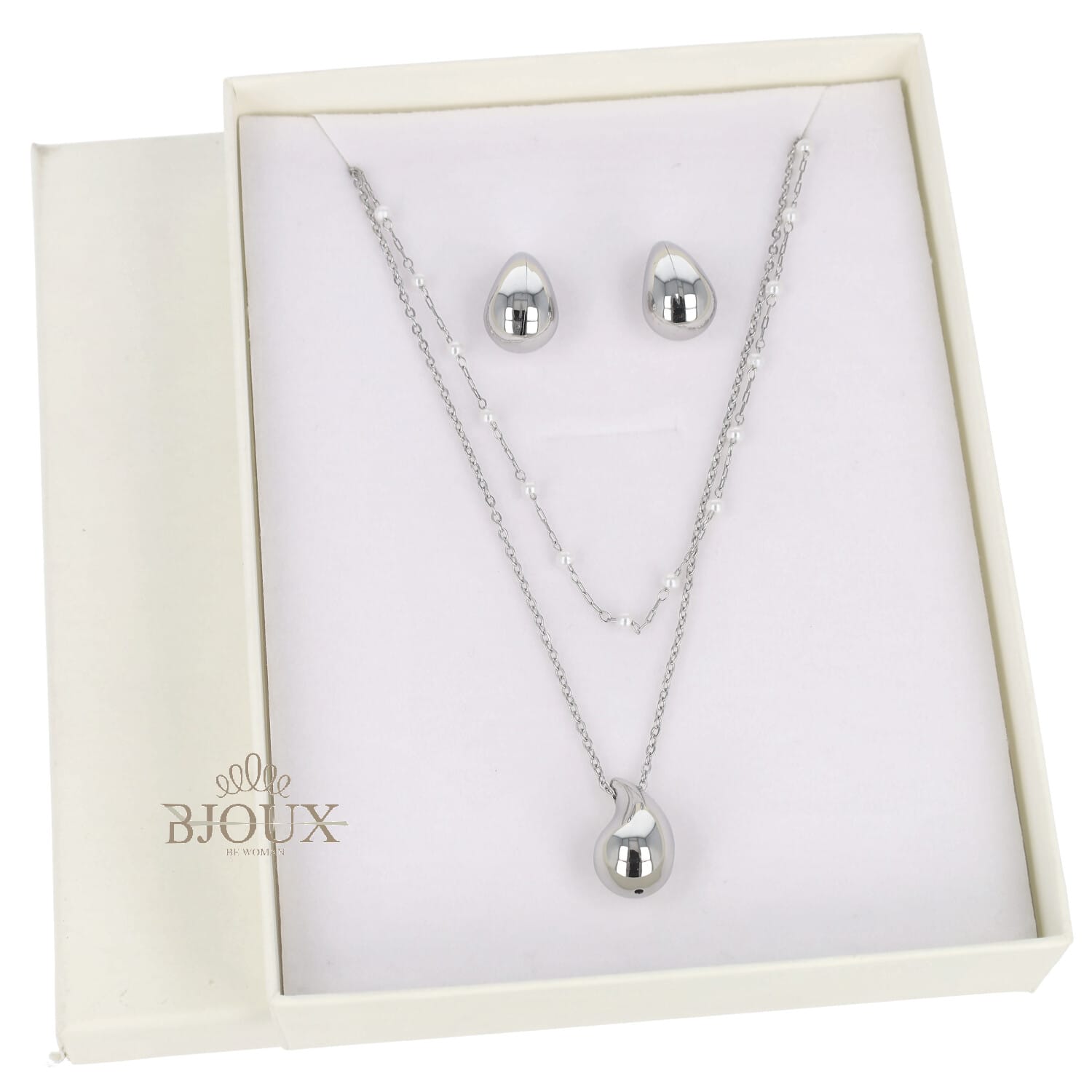 Idea regalo composto da una collana da donna in acciaio inossidabile a due fili con perline e con goccia da 21 mm abbinata a orecchini a perno goccia da 21ย mm.