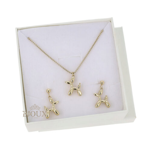 Idea regalo composto da una collana da donna in acciaio inossidabile con ciondolo cagnolino. Lunghezza 20cm + 5 cm estensione abbinata a orecchini a perno con cane pendente.