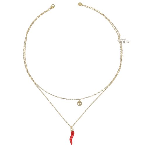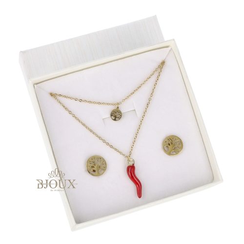 Collana in acciaio inossidabile a catena con extension per regolarne la misura. Con albero della vita e cornetto rosso portafortuna da 1,5 cm con orecchini in acciaio con perno . In astuccio regalo 9×9