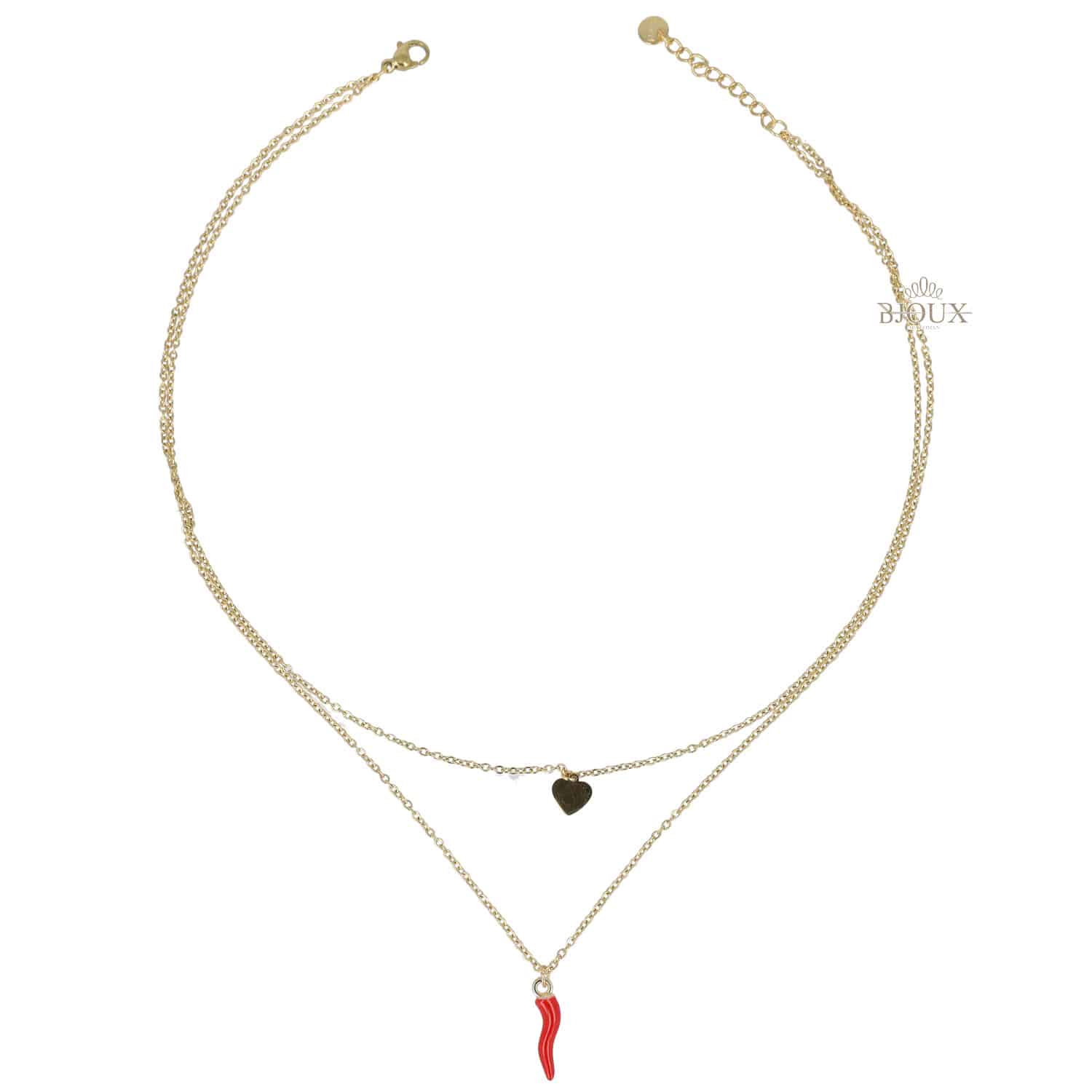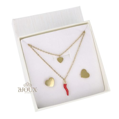 Collana in acciaio inossidabile a catena con extension per regolarne la misura. Con cuoricini e cornetto rosso portafortuna da 1,5 cm con orecchini in acciaio con perno . In astuccio regalo 9×9