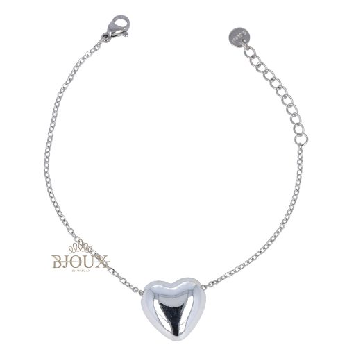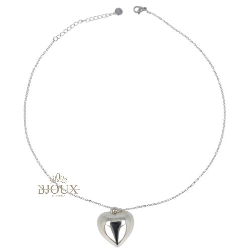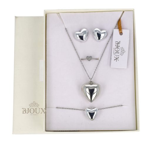 Collana bigiotteria con catenina in acciaio regolabile 42+5 cm , con ciondolo cuore in ottone da 2,5 cm abbinata al bracciale della stessa serie ,orecchini a perno con cuore e anellino cuoricino strass. In astuccio regalo 12×16