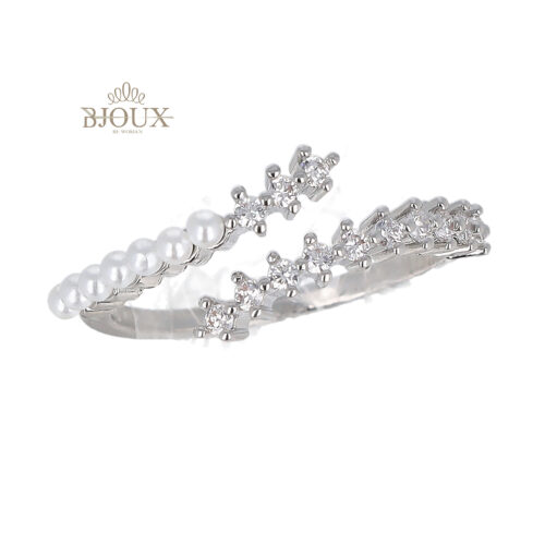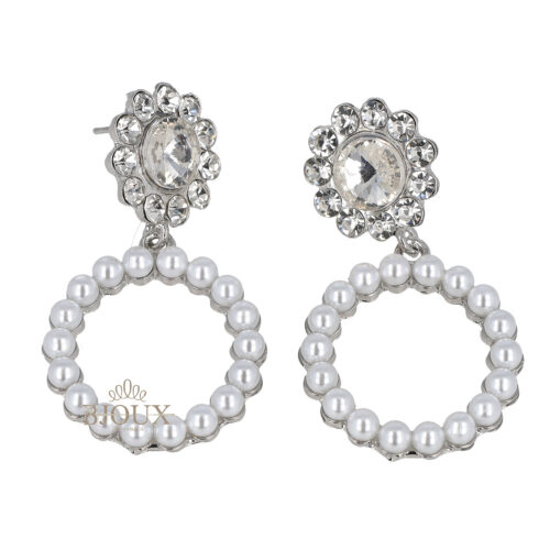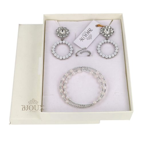 Idea regalo composta da un bracciale a spirale due fili con strass e perline, orecchini a perno con fiore in strass e tondo decorato da perline 6×3 cm e anellino regolabile. In astuccio regalo 12×16