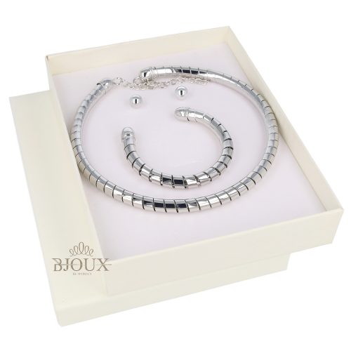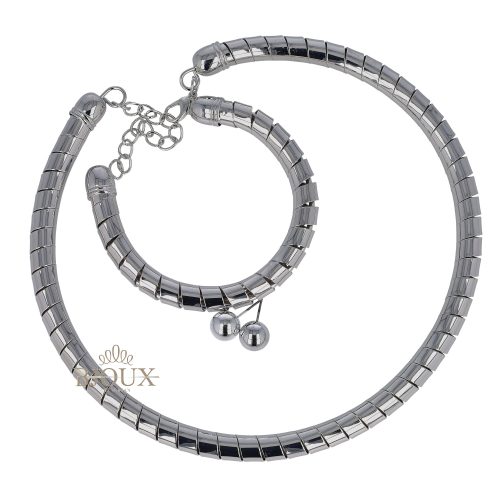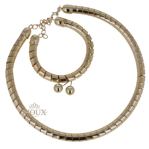 Parure bigiotteria composta da un collarino semirigido in ottone modello tubogas, bracciale semirigido e orecchini anallergici sfera con perno. In astuccio regalo 15×20