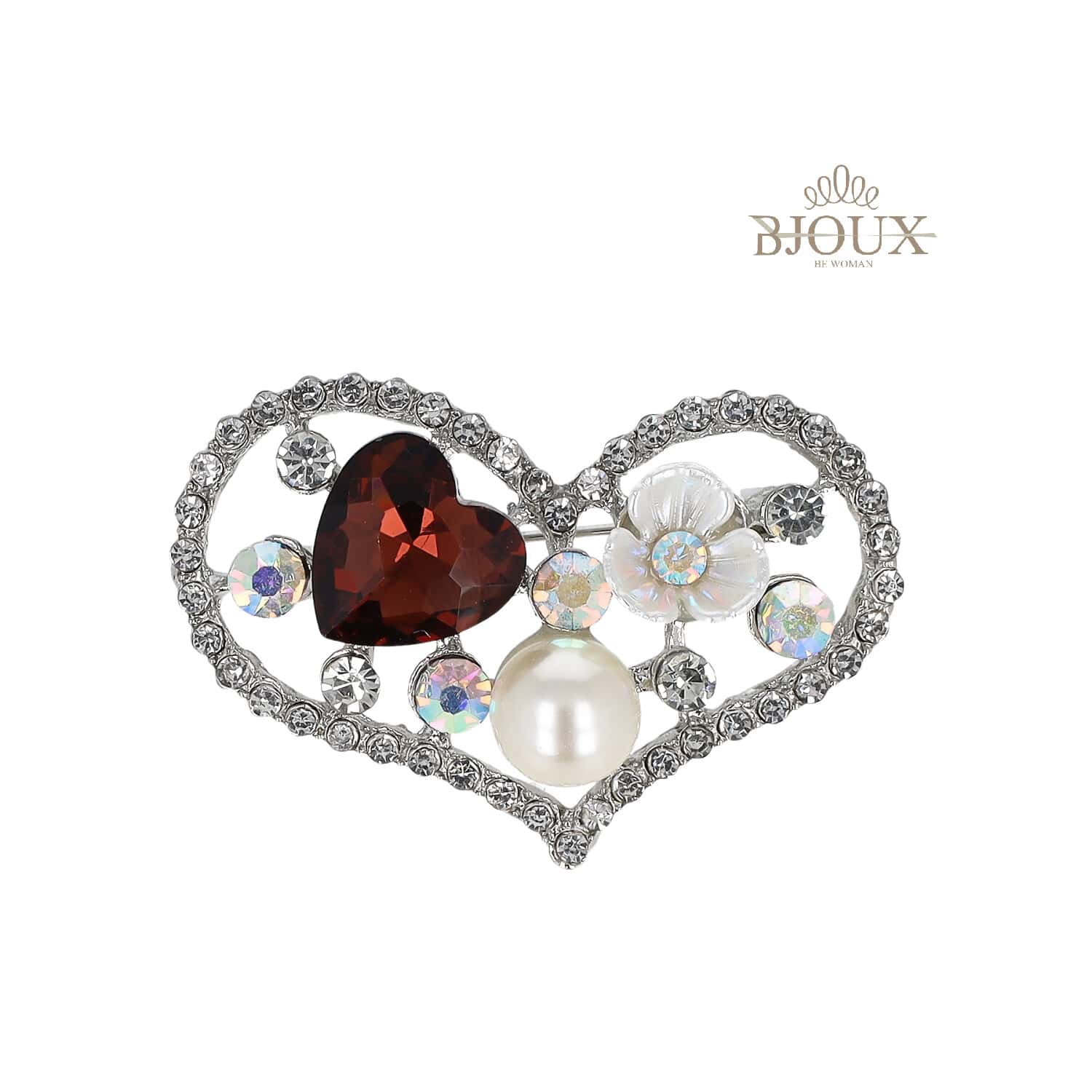Spilla gioiello in ottone dipinto color oro o color rodio con cuore decorata da strass e pietra colorata