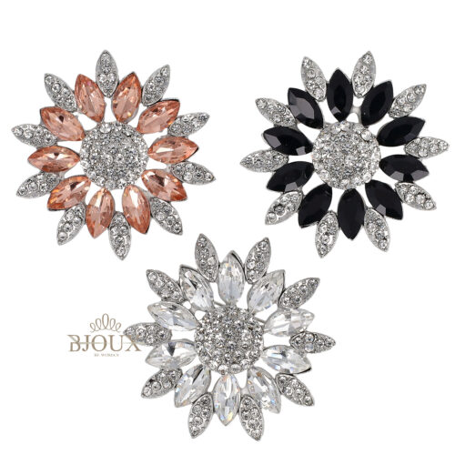 Spilla gioiello in ottone dipinto color oro o color rodio con decoro pietre colorate e specchiate a forma di fiore con strass. Diam. 4,5 cm