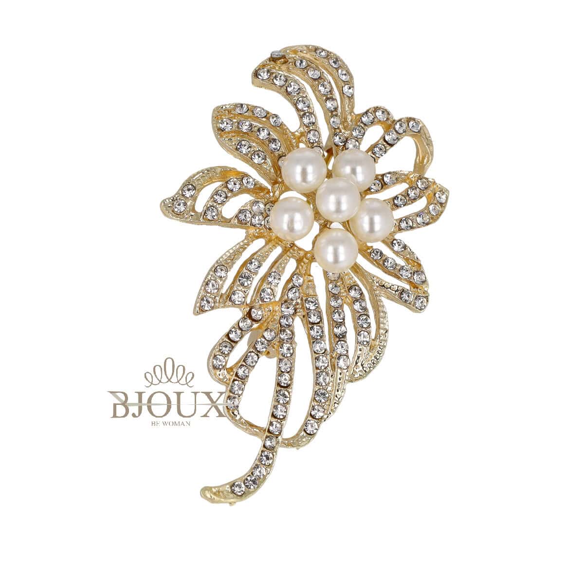 Spilla gioiello in ottone dipinto color oro o color rodio con decoro pietre strass. Misura largh. 4,5 x h. 6 cm
