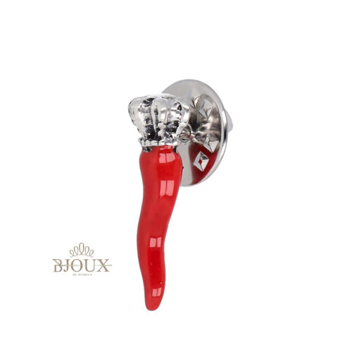 Spilla portafortuna con corona rodiata in ottone. Corno rosso smaltato
