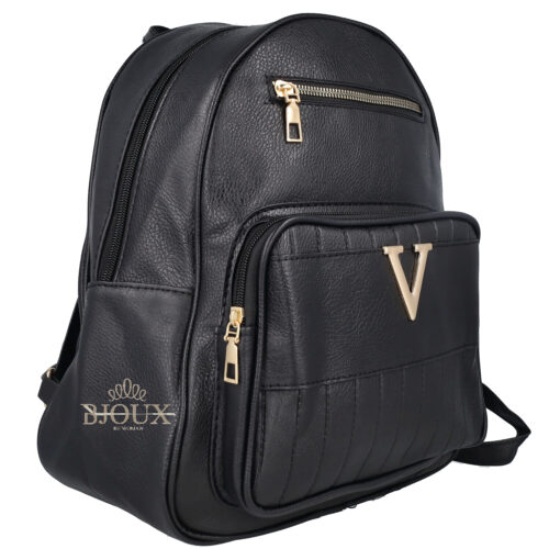 Zaino da donna in ecopelle colorata con 3 tasche, e applicazione V in ottone dorato . Tracolle regolabili. Misure 33x28x16